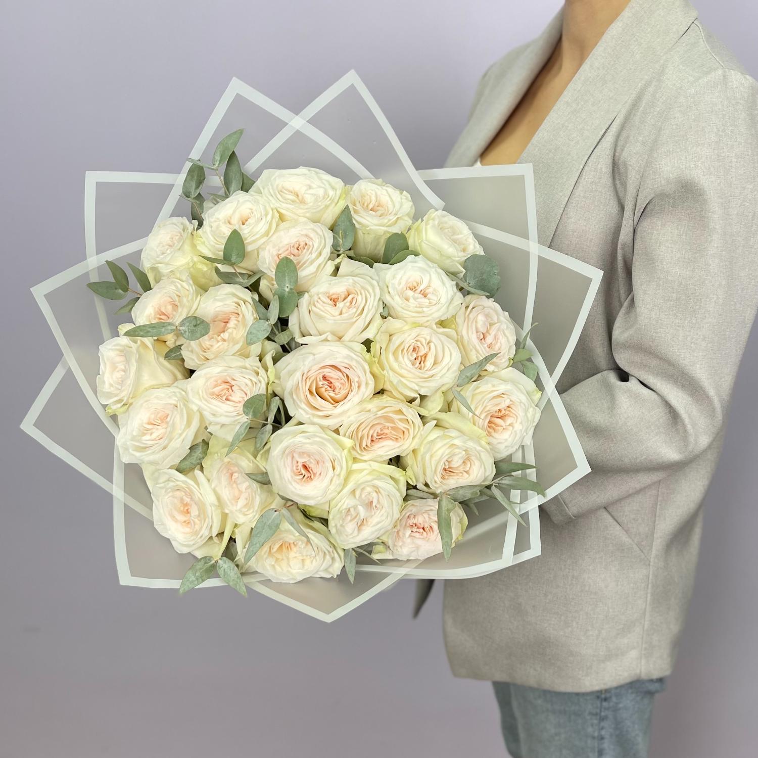 Букет из 25 роз сорта Вайт Охара в глянцевой пленке