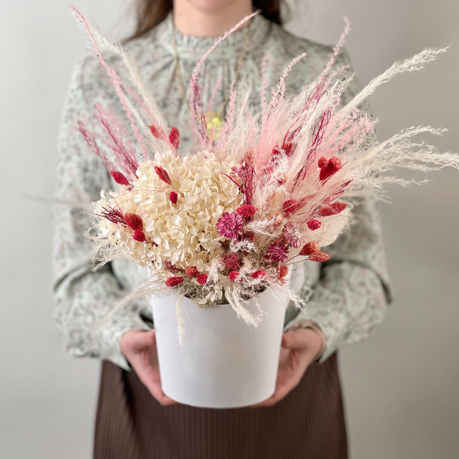Композиция сухоцветов из малиновой гомфрены, белой гортензии и мопасных трав в белой коробке