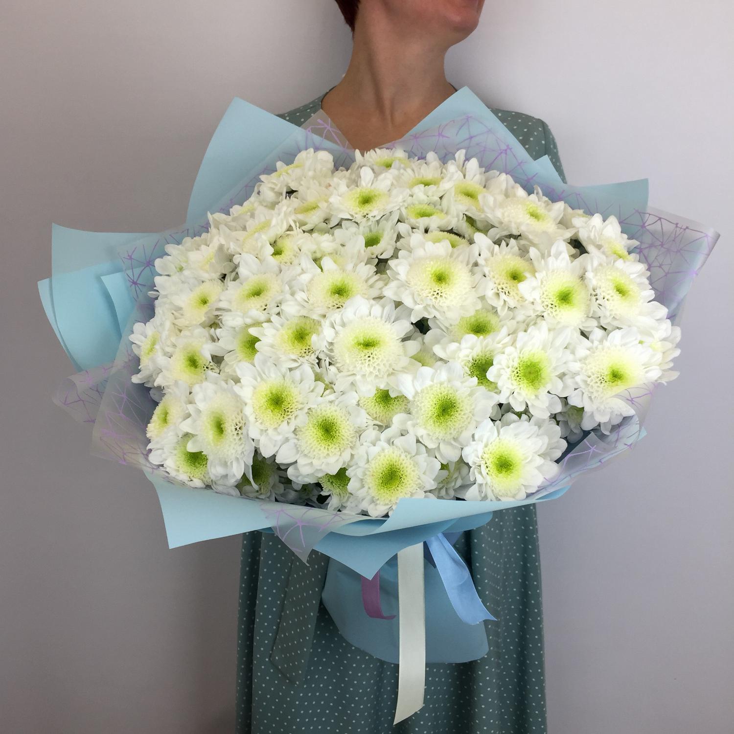 Монобукет из белых кустовых хризантем в голубой упаковке