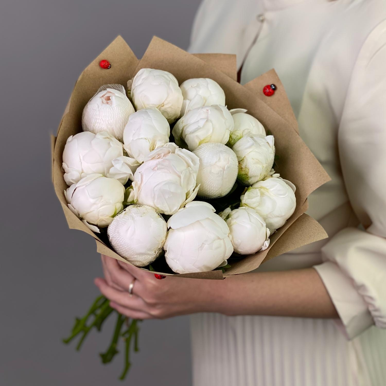 Монобукет из 15 белых пионов в крафтовой упаковке