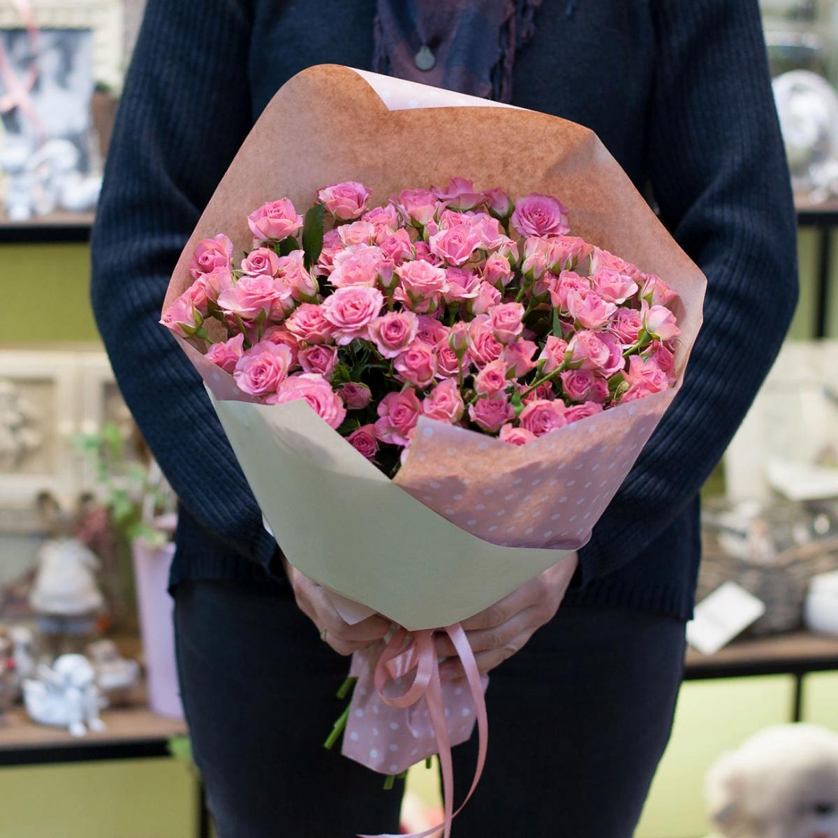 Монобукет из розовых кустовых роз в крафтовой упаковке
