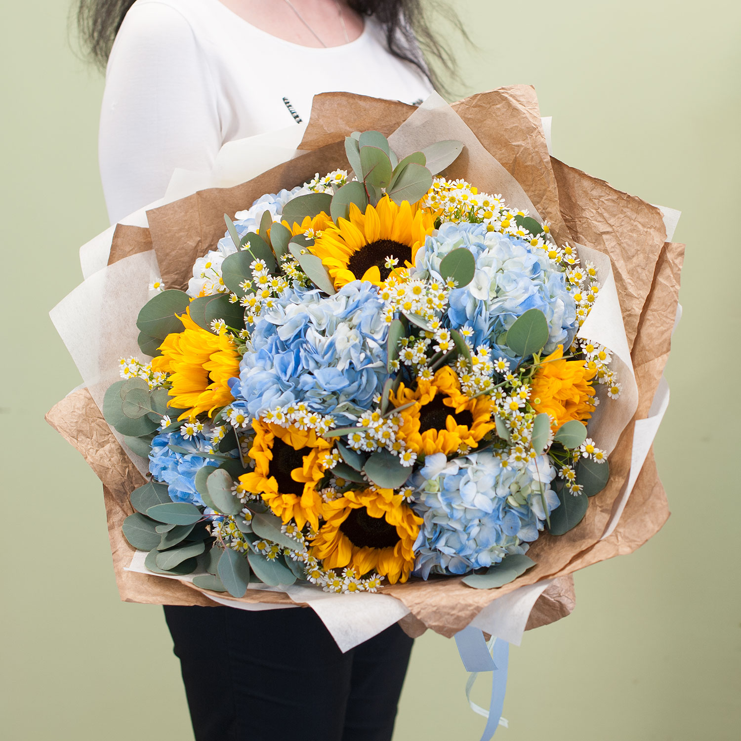 Большой букет из подсолнухов и голубых гортензий в крафтовой упаковке