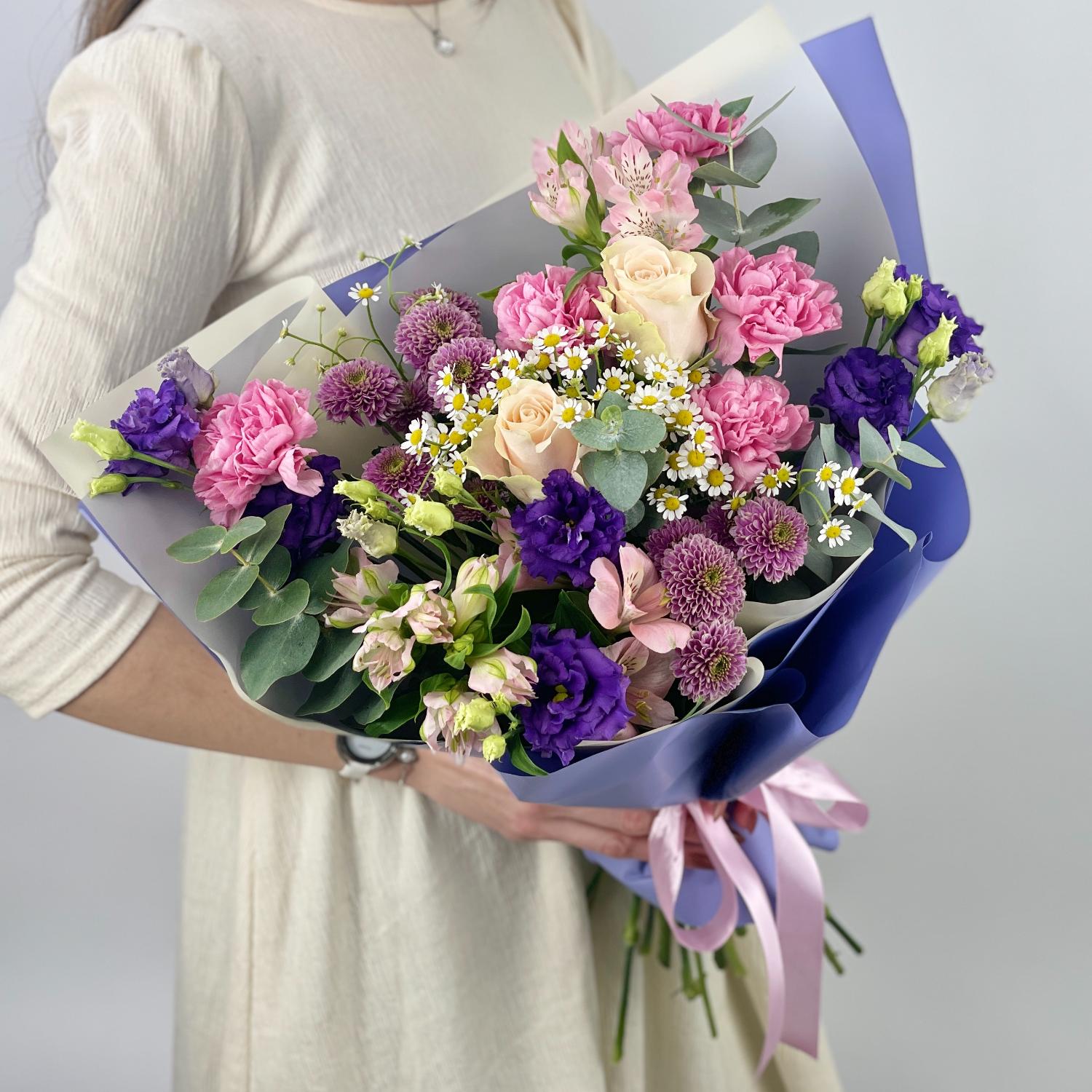 Роза Шармант - 2 шт Диантус, (гвоздика), розовый - 5 шт Ромашка Камилла - 4 шт Сантини фиолетовый помпон, фиолетовый…