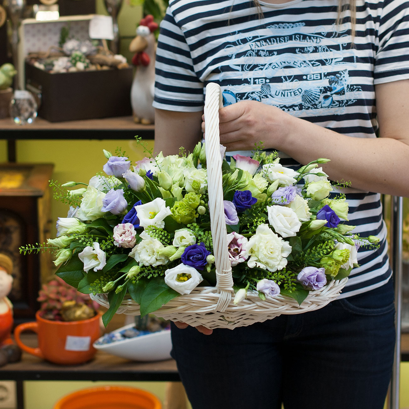 Эустома (Лизиантус), микс - 11 шт Грин белл, зеленый - 4 шт Салал - 6 шт Корзина белая, диаметр 28…
