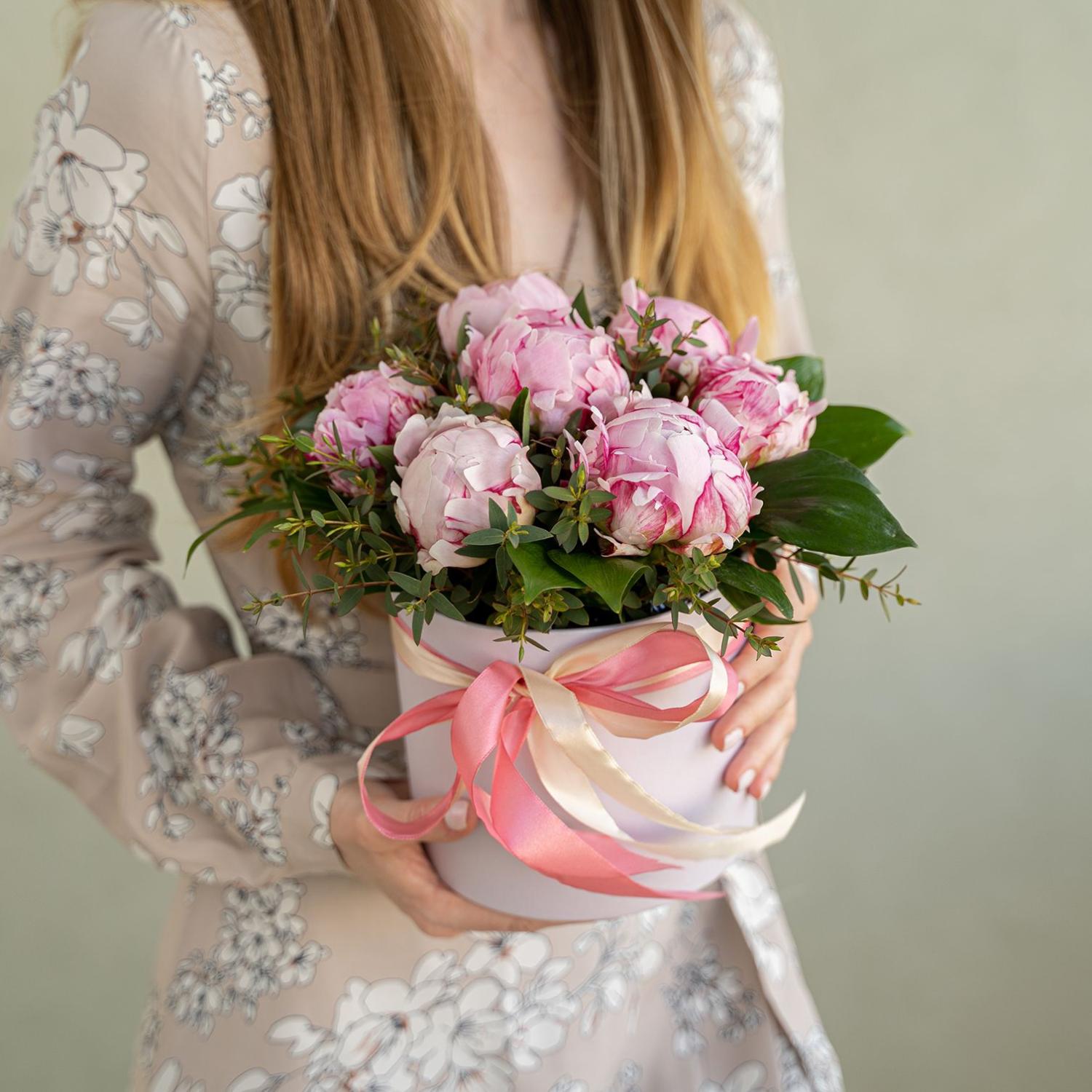 Пион, Сара Бернар, нежно-розовый - 7 шт Эвкалипт Парфифолия - 2 шт Салал - 3 шт Шляпная коробка белая (выс.…