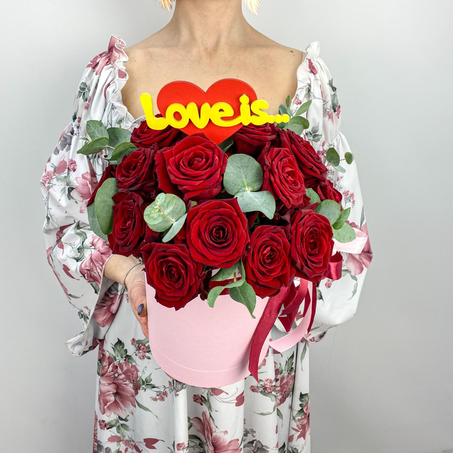 Роза Ред Наоми, 60 см. - 19 шт Эвкалипт Бэби Блу - 1 шт Топпер Love is - 1 шт…