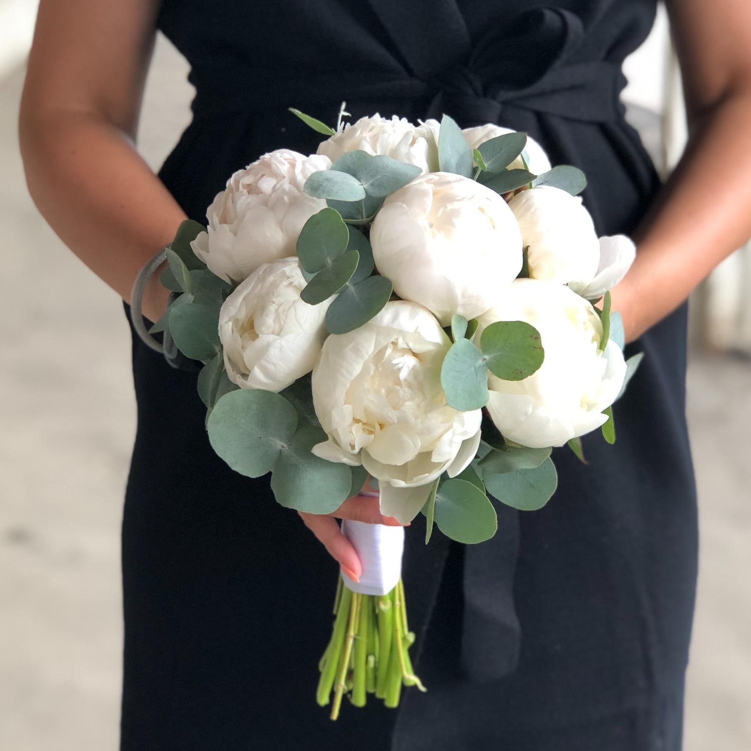 Нежный букет из пионов в сочетании с эвкалиптом — неувядающая классика