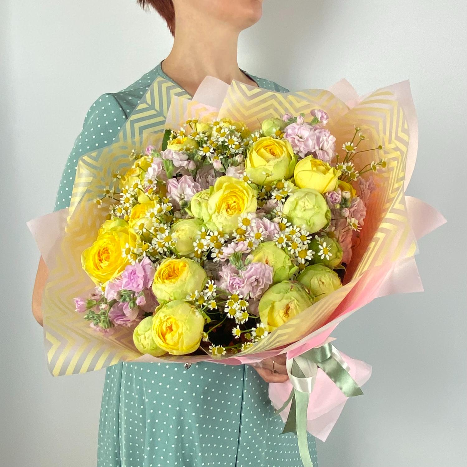 Букет из желтых кустовых роз и розовых маттиол в стильной упаковке