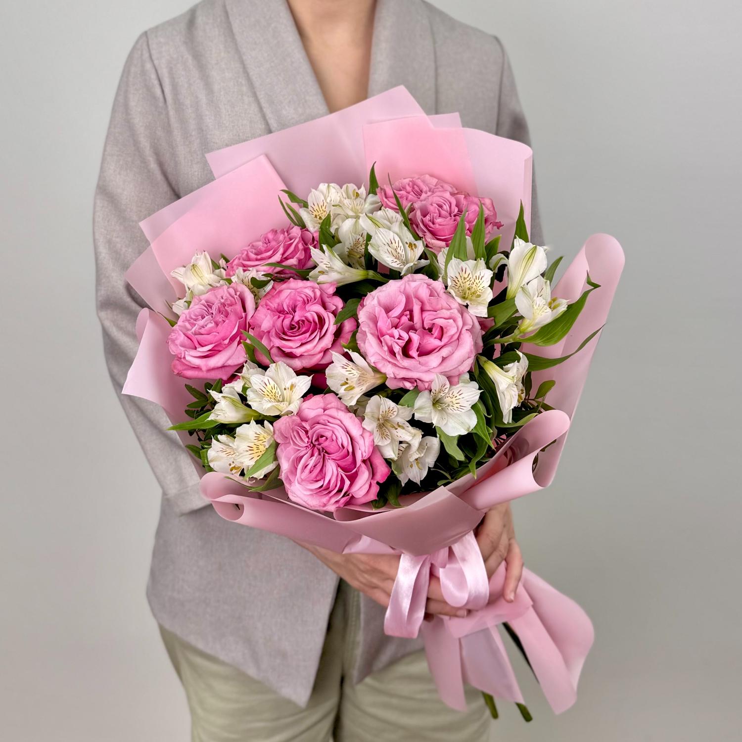 Букет из розовых пионовидных роз и белых альстромерий в розовой упаковке