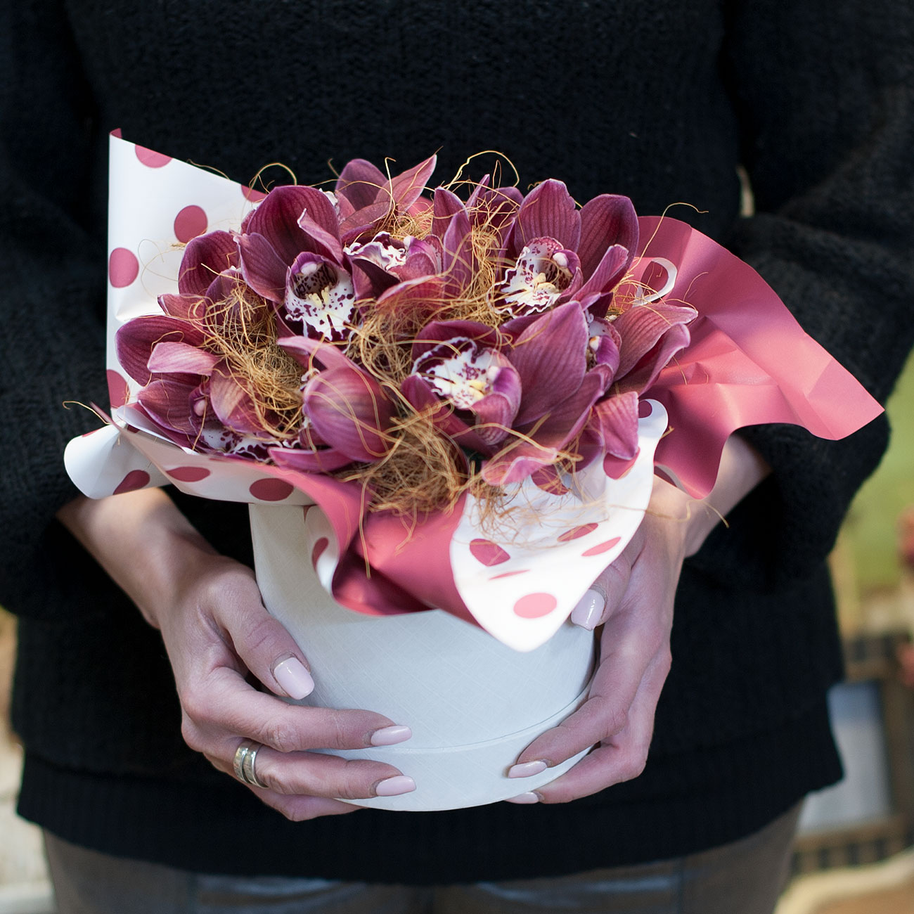 Орхидеи цимбидиум в шляпной коробке
