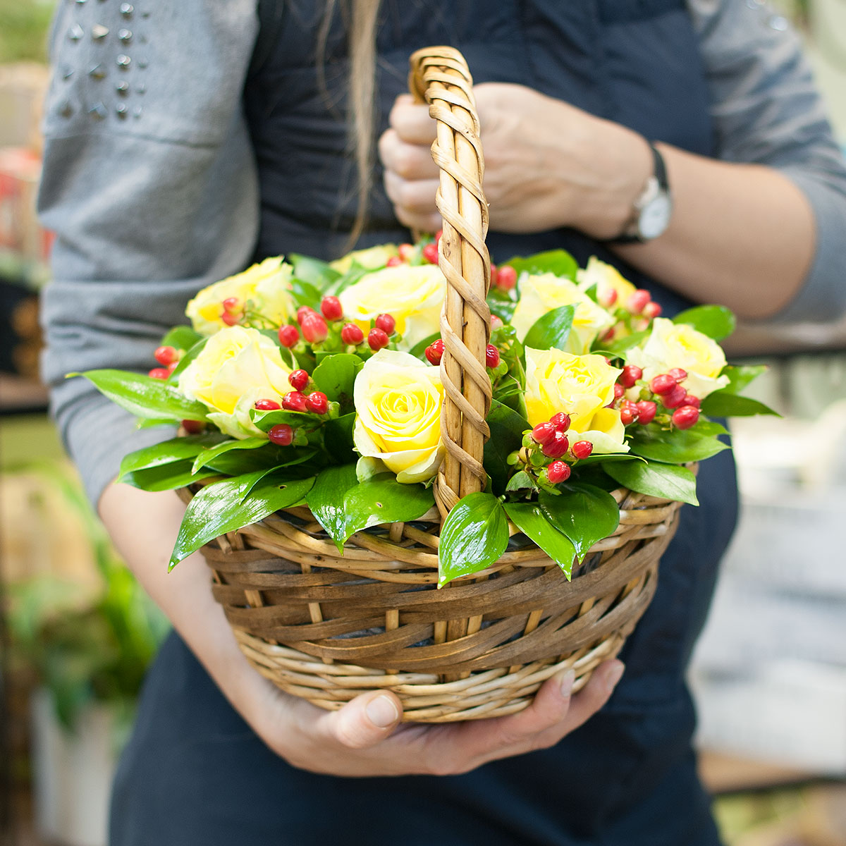 Роза желтая - 9 шт Гиперикум красный - 5 шт Салал 1/3 пачки Корзинка - 1 шт
