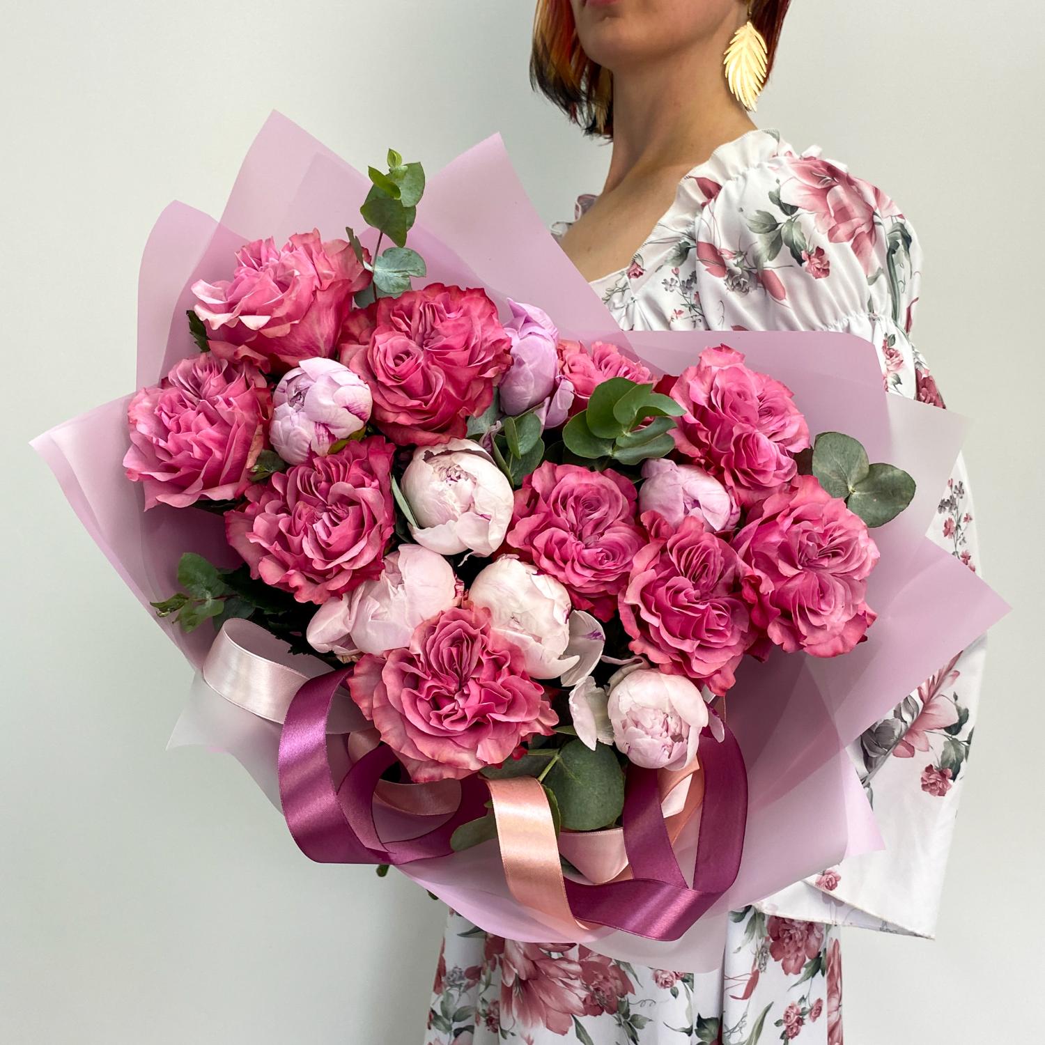 Роза кустовая пионовидная, Мисти Бабблз, малиновая, 50 см. - 21 шт Роза Джульетта, 50 см. - 18 шт Эвкалипт Бэби…