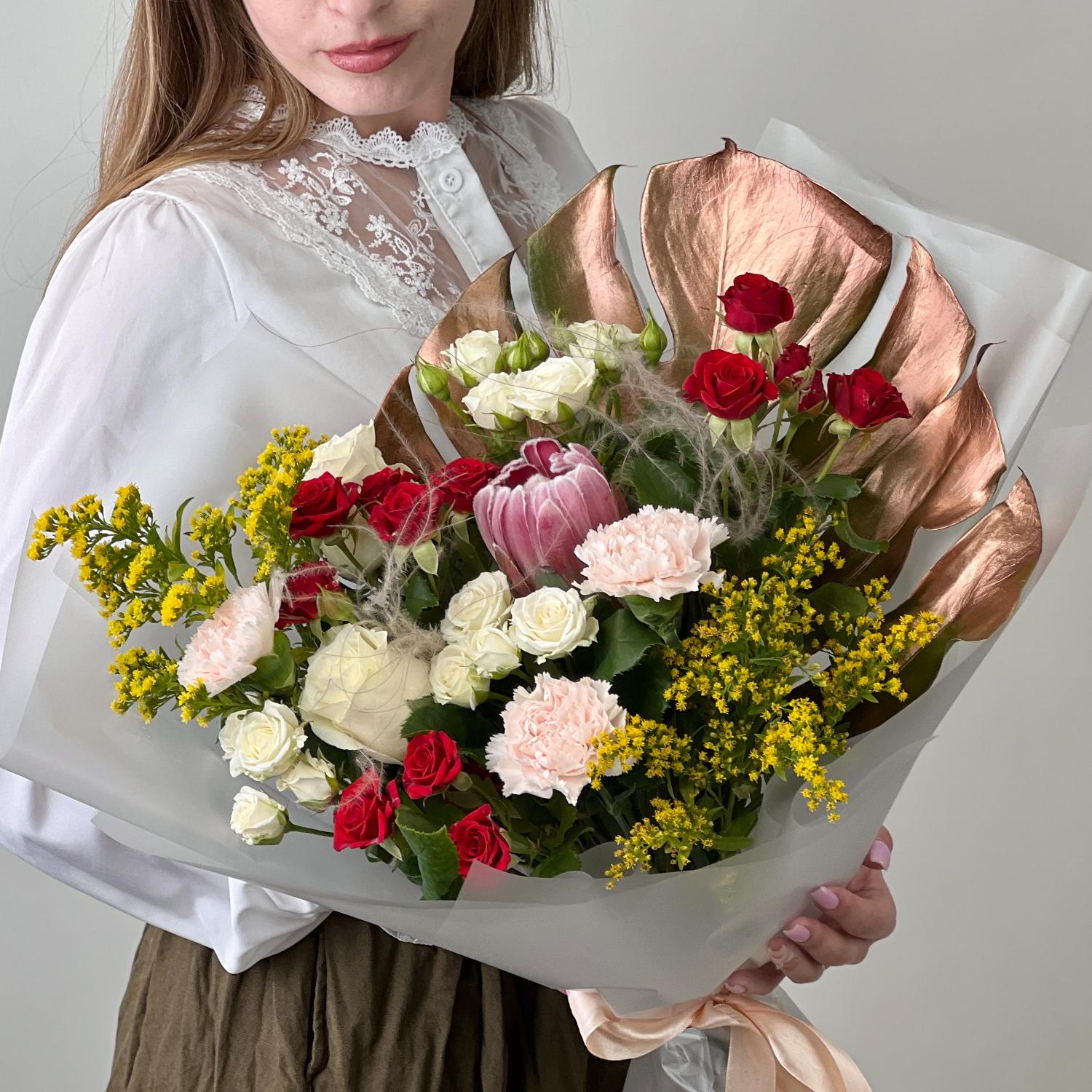Разноцветный букет белых и красных кустовых роз, дополненный экзотичной протеей и позолоченным листом монстеры