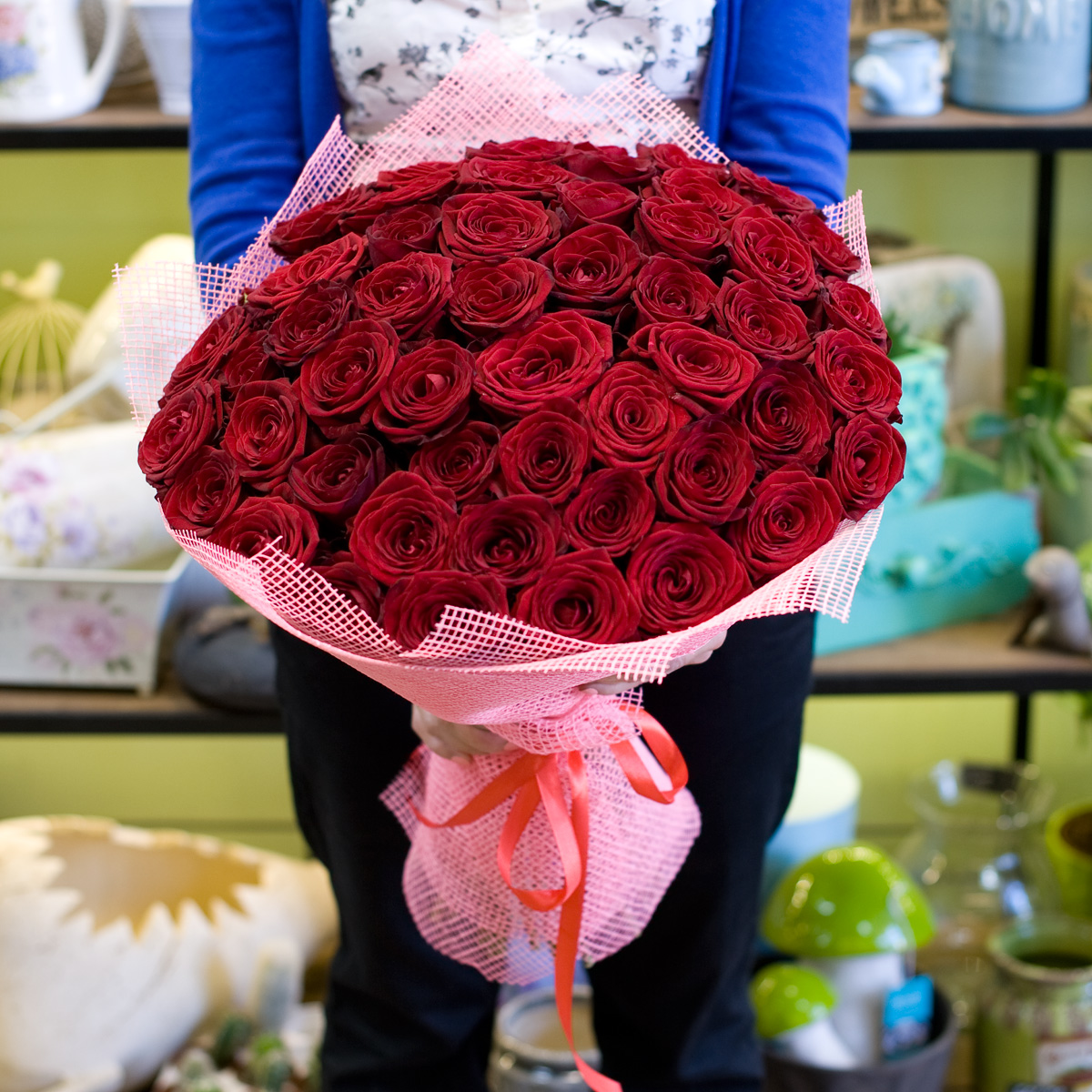 Монобукет из 51 розы Ред Наоми в розовой упаковке