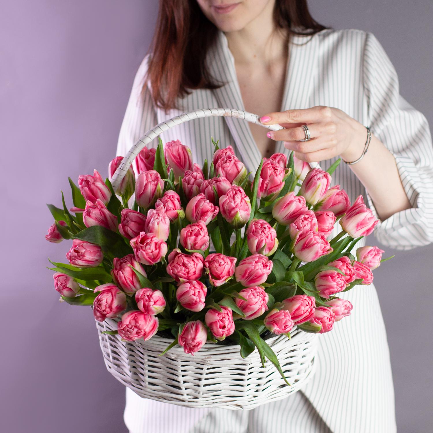 Тюльпан пионовидный, Колумбус, розовый - 101 шт Корзина круглая (выс. 15 см, выс. с ручкой 50 см, шир. 30 см)…