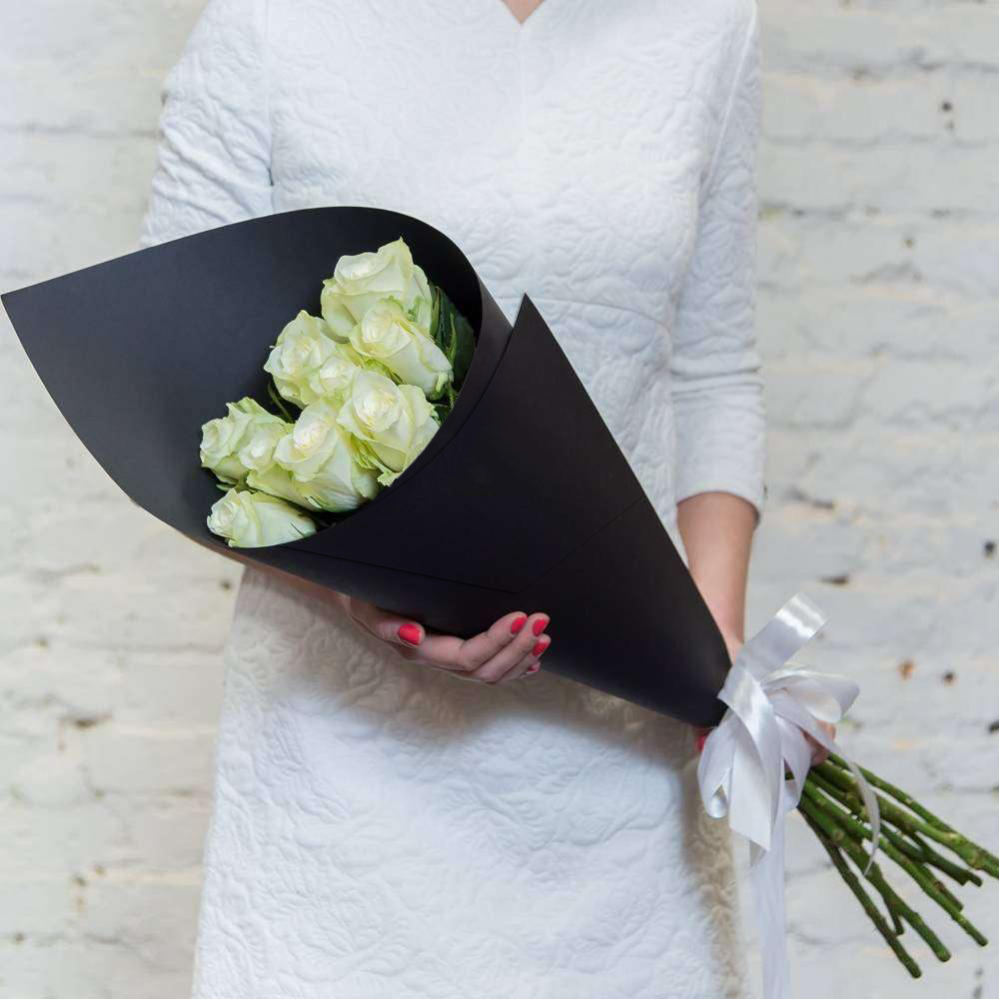 Лента атласная белая - 1 шт Роза Мондиаль, Эквадор, белая, 50 см. - 9 шт Фоамиран, Израиль, черный - 1…