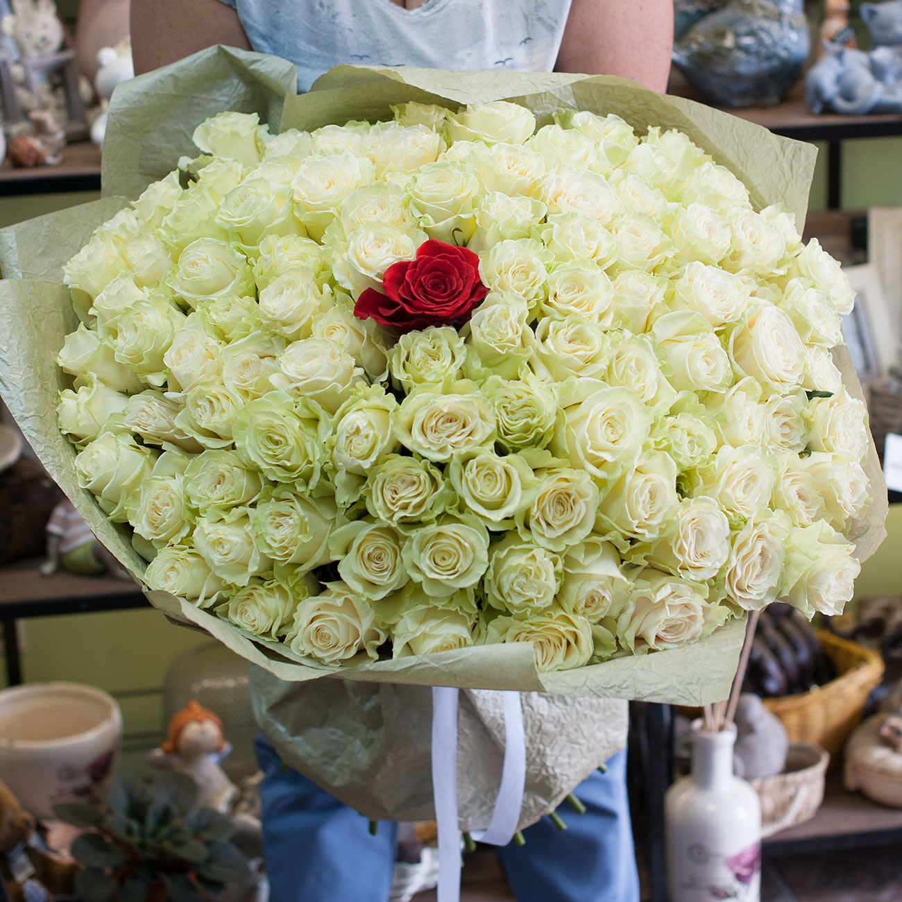 Розы премиум класса белые - 100 шт Розы премиум класса алая - 1 шт Крафт - 1 шт