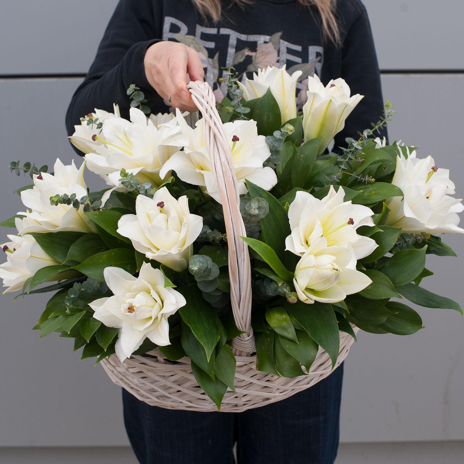 Большая композиция из 7 белых лилий в корзине