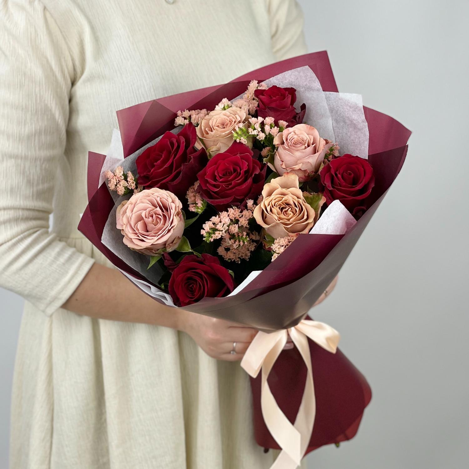 Букет из роз Эксплорер и роз Капучино в бордовой упаковке