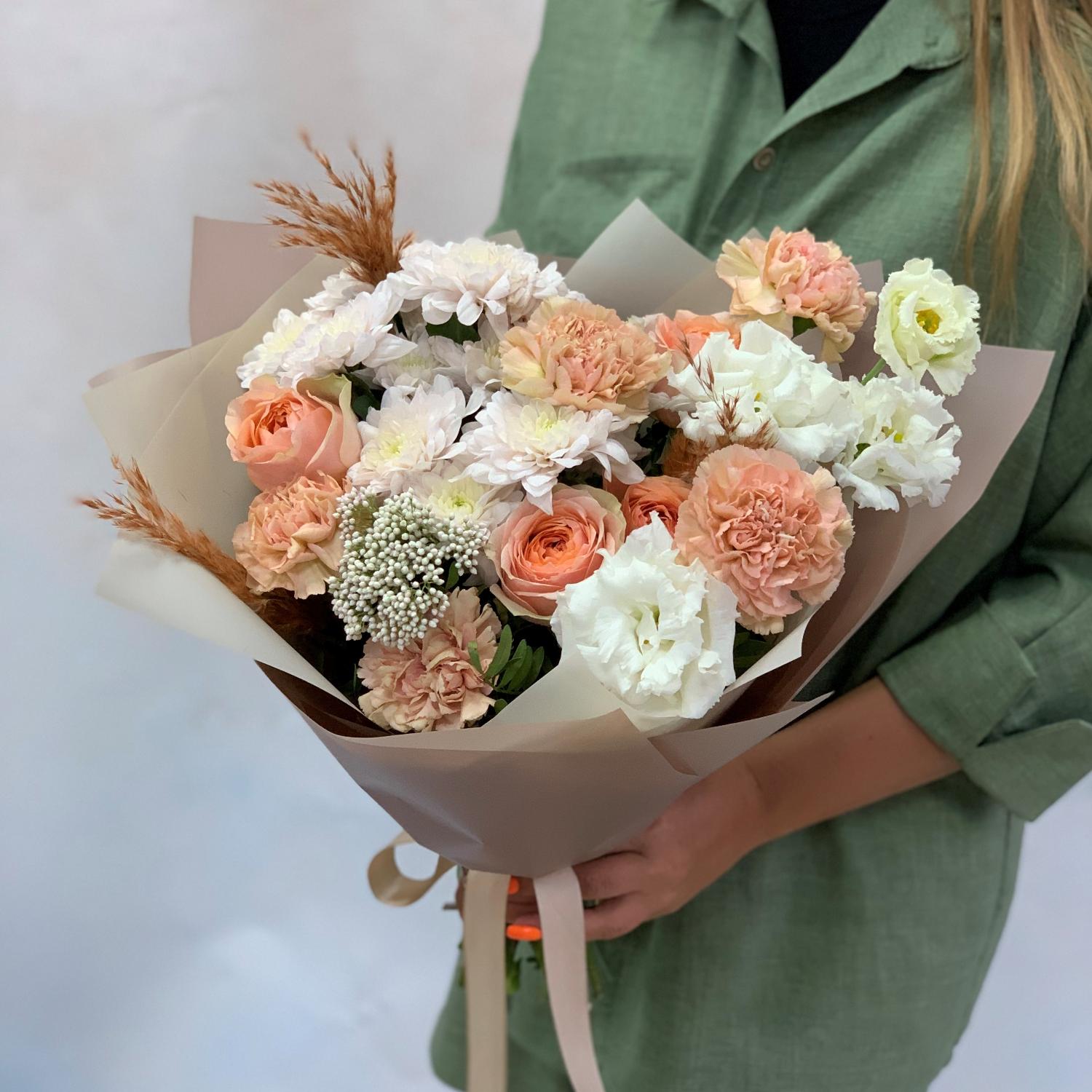 Авторский букет из белых эустом, белых кустовых хризантем и кремовых диантусов в упаковке