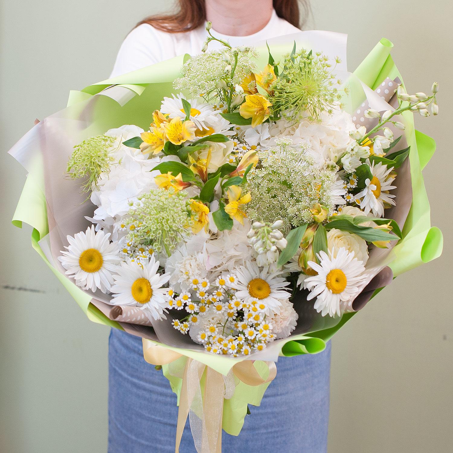 Летний букет из крупной ромашки, белых гортензий и желтых альстромерий в ярко-зеленой упаковке