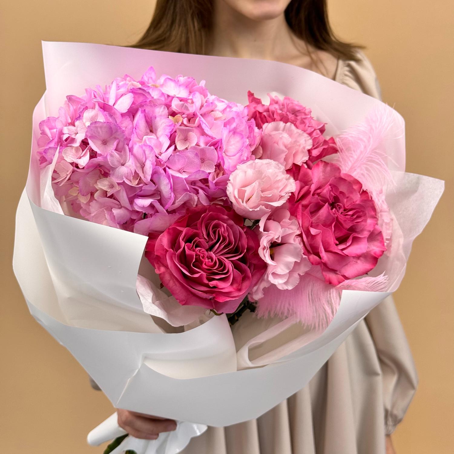 Классический букет в розовой гамме из гортензии, роз и эустомы в белой упаковке