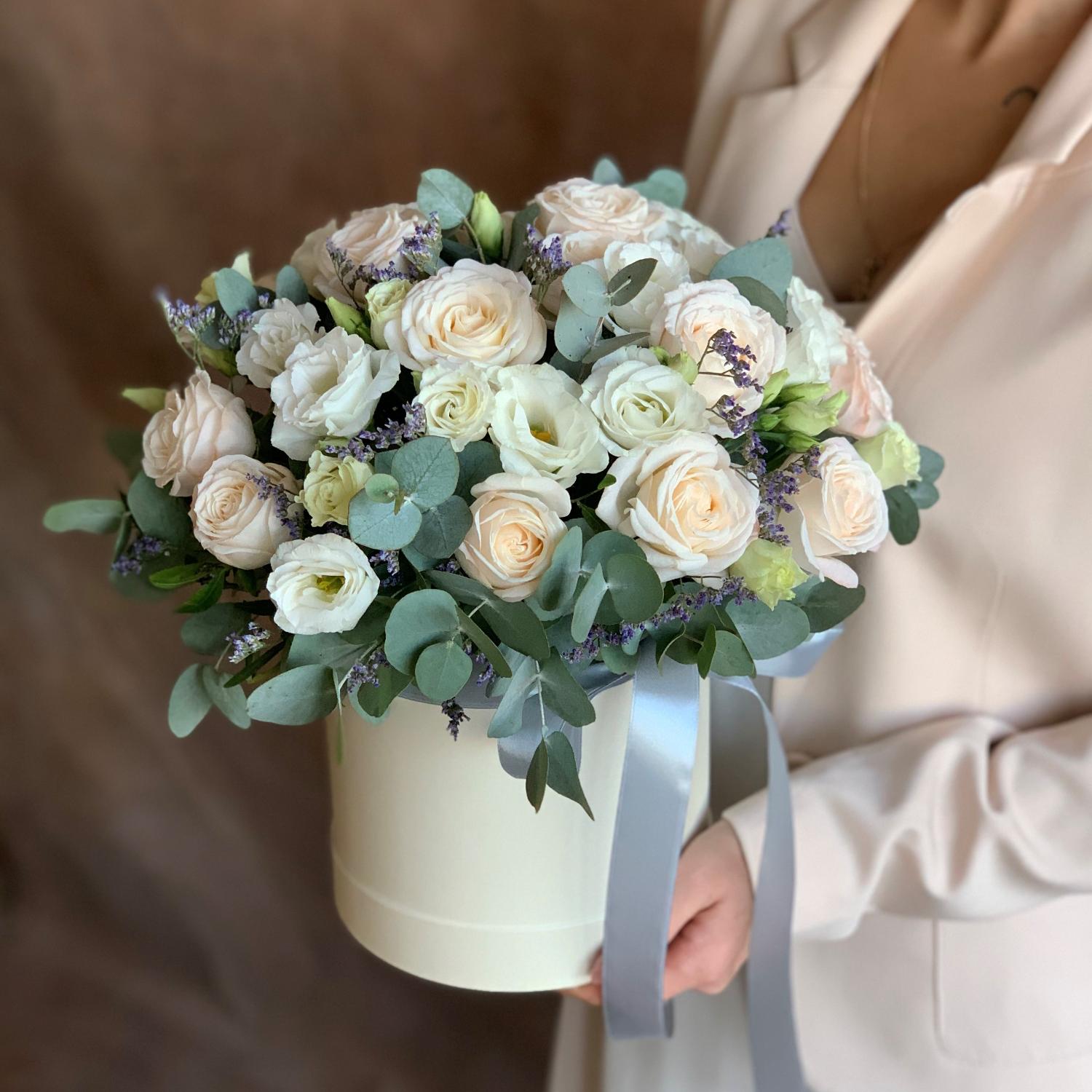 Лимониум фиолетовый - 1 шт Роза Яна, кустовая, кремовая, 40 см. - 7 шт Шляпная коробка, серая (выс. 17 см,…